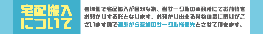 ・宅配以外で参加が困難なサークル様はフォームのその他ご要望欄にご記入頂くか問合せフォームよりご一報ください。